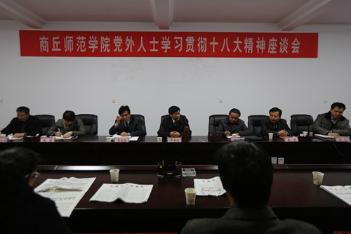 座谈会上,与会代表畅所欲言、各抒己见。民革商丘师院支部主委、美术学院蔡松立教授发言指出:十八大报告内容阐述深刻、亮点突出,值得各部门深入学习贯彻;民盟商丘师院基层委员会主委、体育学院副院长李萍副教授表示非常期待中共提出的“五位一体”、“美丽中国”等美好目标的最终建成;民进商丘师院支部主委、环境与规划学院副院长赵文亮博士对十八大召开的重要意义阐述了个人见解;九三学社商丘师院基层委员会主委、生命科学学院副院长徐心诚副教授对报告中关于建设“爱国统一战线”的论述倍感亲切、认为报告催人奋进;农工民主党商丘师院负责人、法学院张雷博士认为十八大的召开意义重大、内容应对有方;无党派人士代表、文学院副院长杨春风博士通过研读报告文本,并结合工作实际畅谈了感想。与会代表一致表示将认真学习贯彻中共十八大精神,为国家的教育事业、为中原经济区建设、为商丘师院的发展作出努力和贡献。