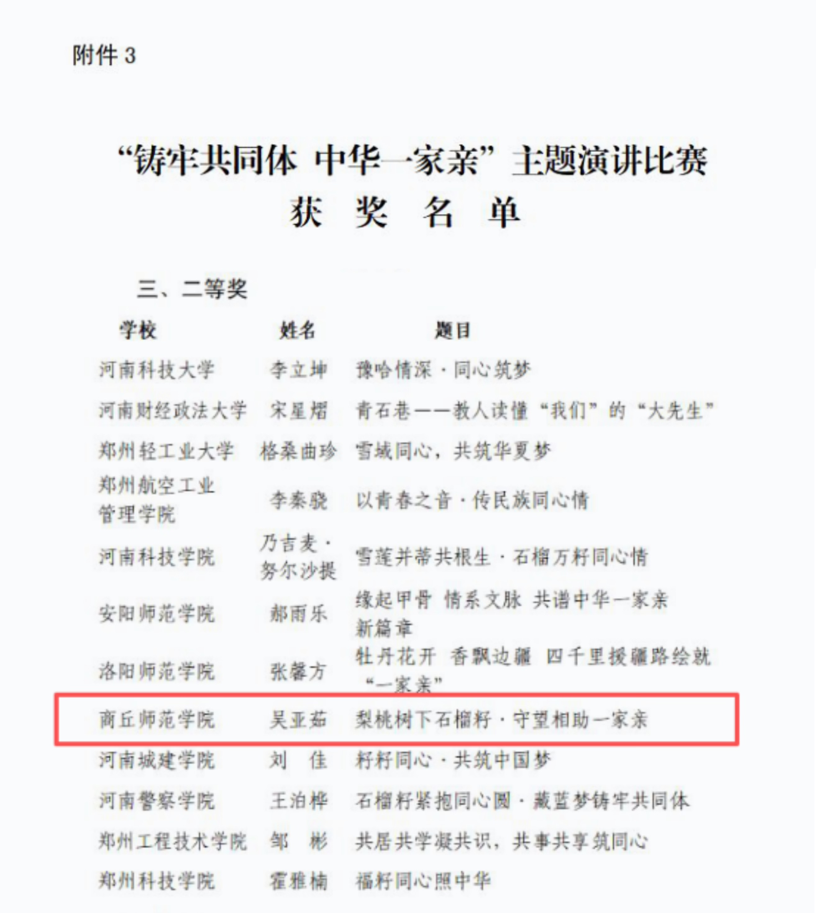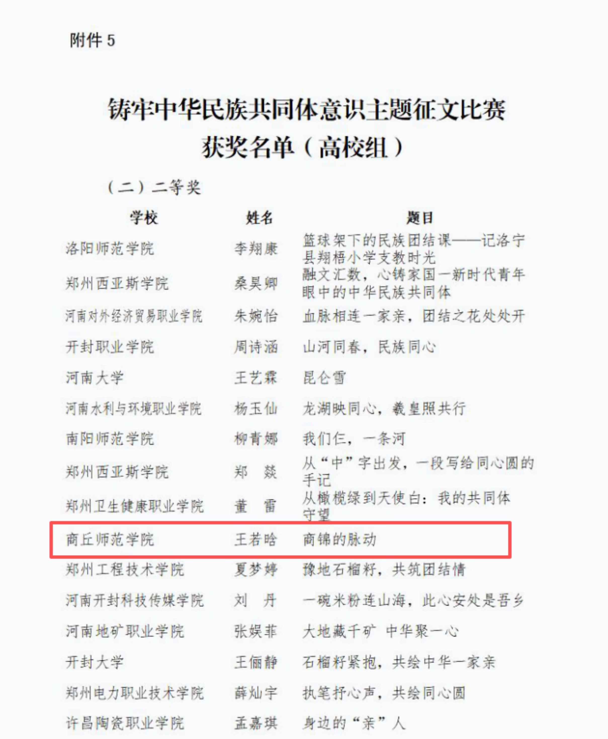 我校马克思主义学院教师刘如意在《中华民族共同体概论》课程教学展示活动中荣获普通高校组一等奖,展现了思政课教师队伍扎实的教学功底和创新实力;传媒学院学生吴亚茹凭借《梨桃树下石榴籽守望相助一家亲》的精彩演讲在“铸牢共同体 中华一家亲”主题演讲比赛中荣获二等奖,彰显青年学子对共同体意识的深刻认知;人文学院赵瑞杰、化学化工学院刘晨冬等12名同学积极参与中国特色社会主义民族宗教理论知识网络答题活动,喜获优秀参与奖;文学院学生王若晗在铸牢中华民族共同体意识主题征文比赛中,凭借作品《商锦的脉动》荣获二等奖,展现了商师学子以笔为媒、厚植共同体意识的青春风貌。