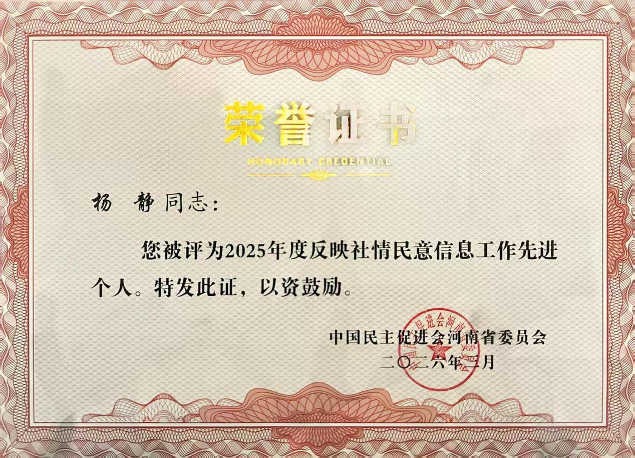 近日,中国民主促进会河南省委员会印发《民进河南省委会关于表彰2025年度反映社情民意信息工作先进个人的决定》(豫进字〔2026〕13号),民进商丘师范学院总支部主委杨静获评“民进河南省委会2025年度反映社情民意信息工作先进个人”,并在全省民进反映社情民意信息工作会议上作交流发言。